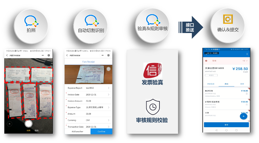 隨著金稅四期的正式啟動以及財政部、國家檔案局《關于規范電子會計憑證報銷入賬歸檔的通知》的發布,發票等財務票據的電子歸檔和保存管理已成為企業必不可少的流程。富士施樂智能費控解決方案采用人工智能技術,可在不改變企業原有IT系統、財務流程/制度、費控制度的前提下,實現隨時隨地差旅和日常報銷的全流程自動化。如員工報銷差旅費時只需簡單幾步:1)打開微信小程序“智能報銷助手”創建費用報告;2)通過手機拍照、選擇相冊圖片、微信卡包、手動輸入、多張票據組合或導入電子發票上傳、提交需報銷票據;3)系統自動切割/識別票據有效信息:4)發票驗真:5)根據食宿、火車座位/飛機倉位等級等企業差旅規定以及預算等規則自動審核/校驗并篩出錯誤或不合格信息,如:電子發票簽章是否被修改、發票號與金稅底賬庫信息是否一致等;6)確認票據信息無誤后提交;7)財務審批、付款。